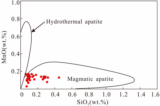 Plots of MnO versus SiO2 in apatites of dacite ( modified from ref. [46]).