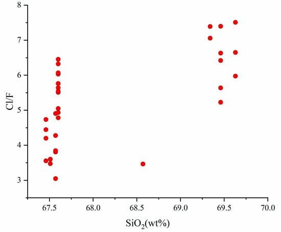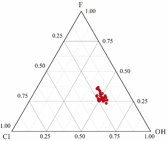 Apatite is one of the rare magmatic minerals containing halogens. For extrusive and hypabyssal rocks, the rapid cooling of magmas allows the preservation of information about magmatic F, Cl, and H2O contents recorded by apatite during its crystallization [72]. Further, apatites crystallized at temperatures above 500 °C are resistant to hydrothermal alteration [73,74], therefore they can be used to deduce the F, Cl, and H2O contents of the host magma.