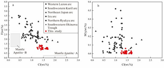 Plots of (a) F versus Cl in apatites of dacite; (b) SO3 versus Cl in apatites of dacite (data from [42,45] and this study).