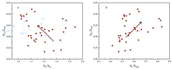 Plots of (a) XCl/XOH versus XF/XCl in apatites of dacite; (b) XCl/XOH versus XF/XOH in apatites of dacite. The arrow shows the trajectory of apatite compositional evolution.