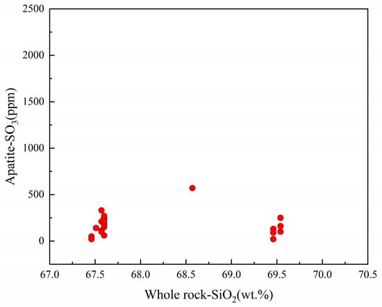 From previous studies, the SO3 content of apatite is a complex function of magmatic temperature, sulfur fugacity and redox state [28,29,54]. According to Peng et al. [29], the partitioning of S between apatites and their host melts is highly dependent on the redox state of the latter. Combining Table 1 and Table S2 in Supplementary Materials, the apatites studied crystallized in narrow ranges of temperature and sulfur fugacity, and their SO3 contents remained essentially stable with magmatic differentiation (Figure 8), which tends to indicate that the magma has a stable redox state during this evolution stage.