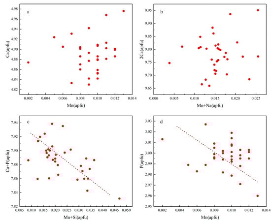 When the above reactions have occurred, there will be an obvious negative correlation between the ions that undergo displacement. In apatite samples, obviously, no negative correlations are shown between Mn and Ca as well as Mn + Na and 2Ca (Figure 9a,b), while a significant negative correlation exists between Mn + Si and Ca + P (Figure 9c), and a moderate negative correlation between Mn and P (Figure 9d). Therefore, it can be concluded that Mn in our samples entered the apatite lattice mainly as Mn3+, and brought SiO44− into the lattice simultaneously. In addition, a few Mn replaced PO43− as MnO43− in the apatite lattice. It indicates that apatites from this study crystallized in a medium oxygen fugacity condition, and the oxygen fugacity only slightly changed during this process.