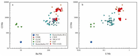 Plots of (a) Cl/Nb versus Ba/Nb and (b) Cl/Nb versus U/Nb in subduction-related volcanic rocks (data from: PM, Primitive Mantle [91]; EMB, Eastern Manus Basin [15]; ELSC, Eastern Lau Spreading Center [10,98]; CLSC, Central Lau Spreading Center [10,98]; Kamchatka VF, volcanic front of Kamchatka [99]; Kamchatka RA, rear-arc of Kamchatka [99]; CKD, The Central Kamchatka Depression [99]; NKA VF, volcanic front of Northern Kurile Arc [99]; IAF, Izu arc front [93]).
