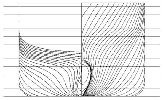 The Kriso container ship (KCS) is used as a case study for assessing the impact of speed reduction on fuel consumption and CO2 emissions. The design speed of KCS corresponds to 22 kn (knots) and the slow steaming speeds range from 18 to 21 kn. The body plan of KCS is presented in Figure 1, and the main particulars are given in Table 1. KCS represents a typical container ship and a benchmark commonly used in numerous studies related to computational fluid dynamics (CFD) [21,22,23]. The container ship sailing route connects China (Shanghai port, = 31.303° N, = 121.667° E) and Germany (Hamburg port, = 54.542° N, = 9.915° E) passes through the Mediterranean Sea and is selected for the case study, Figure 2.