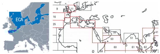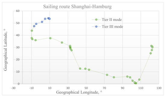 Because part of the analyzed sailing route passes through ECAs (emission control area), Figure 2, the selected DF engine complies with IMO’s Tier II and Tier III (for ECAs) regulations. It should be noted that Tier II refers to non-ECAs (in the rest of the paper moderate ECAs, MECAs), where according SOx rules [31] mass sulfur fraction in FO and PFO must be , while Tier III refers to ECAs with mass sulfur fraction . Consequently, inside ECAs DF engines must be fueled by the ultra low sulfur fuel oil (ULSFO) with , and outside ECAs (MECAs) by the very low sulfur fuel oil (VLSFO) with . In general, both ULSFO and VLSFO can be either marine gas oil (MGO), distillate (DM), or residual (RM) marine fuels.