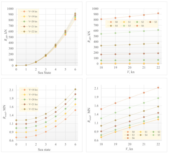 Added resistance in waves for various sea states (upper left) and sailing speeds (upper right) and total resistance in waves for various sea states (lower left) and sailing speeds (lower right).