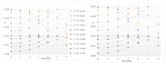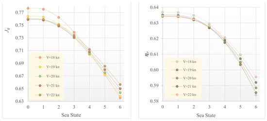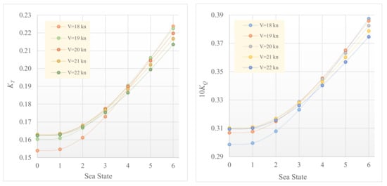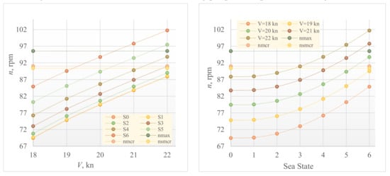 The balancing rate of revolution is calculated for each ship speed and sea state, i.e., . Based on the calculated , other propulsion parameters, such as the propeller advance ratio and torque coefficient are determined, as well as propeller efficiency . Finally, the balancing value of the engine torque, taking into account the propeller shafting efficiency , and the balancing value of brake power are calculated by the following expressions, respectively: