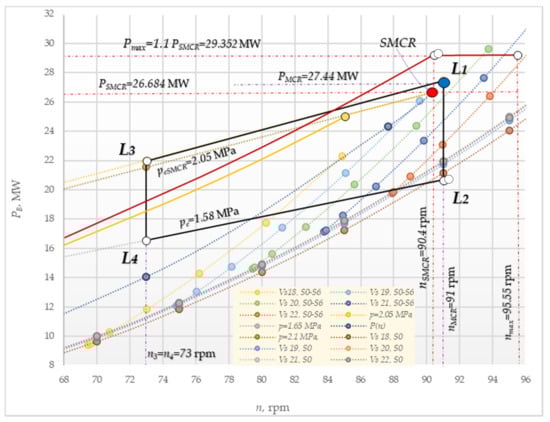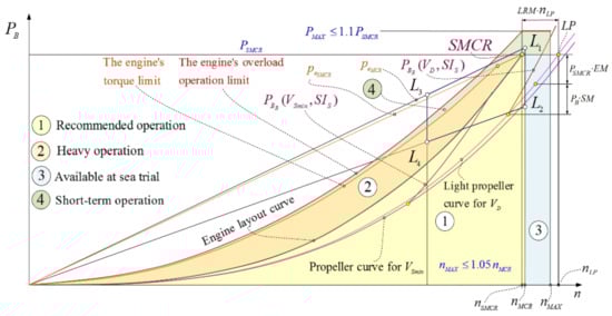 The selection DF engine is based on the fact that SMCR (specified maximum continuous rating) must be located within the engine layout diagram (inside of the quadrangle defined by points L1, L2, L3, and L4), Figure 3. For the SMCR, corresponding break power and the rate of revolution are calculated as follows: