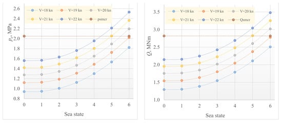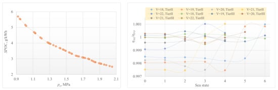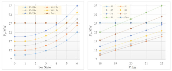 At higher speeds and in harsh sea states, the DF engine cannot balance propulsion loads during continuous operation due to the operational characteristics of the DF engine selected, Figure 8, Figure 9 and Figure 10. Namely, at higher continuous propulsion loads, the engine operating point must be in areas 1 and 2, as presented in Figure 7. Consequently, for S6 the investigated ship could not achieve 20, 21, and 22 kn, and for S5 the ship could not achieve 21 and 22 kn, Figure 9. Limiting operation conditions that cannot be exceeded during continuous operation of the selected DF engine follow: , and .
