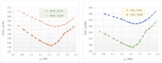 For sailing at the design and slow steaming speeds, with the determined SMCR of the selected engine, four optimization variants, concerning the reduction in the specific fuel oil consumption (SFOC) and consequently CO2 emissions, have been conducted using the MAN computerized engine application system (CEAS). These variants include FO and NG modes complying with Tier II and Tier III regulations (TR-Tier Regulations). In the remaining part of the paper, Tier II and Tier III are indexed by II and III, respectively.