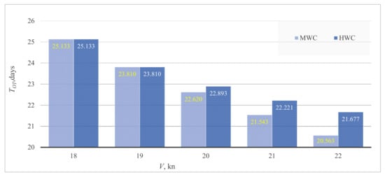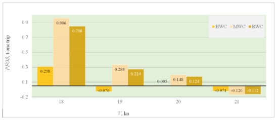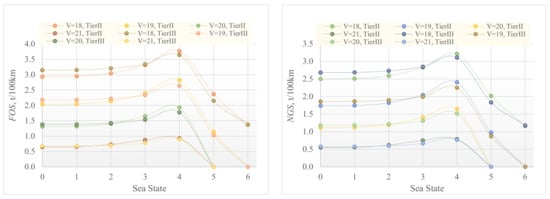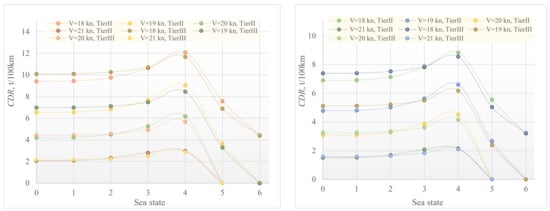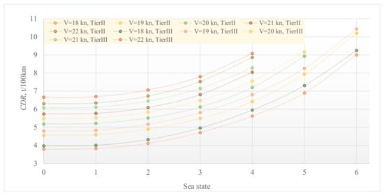 where corresponds to the sea state within TR areas, is the maximum attainable sailing speed for the installed propulsion system, and is slow steaming speed. It should be noted that and are calculated concerning the maximum attainable sailing speeds in realistic sailing conditions defined by sea states expected in each segment of the sailing route.