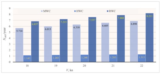 By assuming that there are no constraints for attainable sailing speed (up to the design speed) under MWC, for one realistic operating profile of a ship is defined as follows: