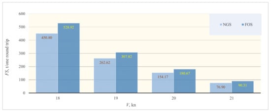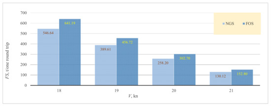 Finally, the fuel savings (FS) and carbon dioxide reduction (CDR), per one kilometer of the sailing route in selected FM at specified TR, for the slow steaming speeds are calculated as follows: