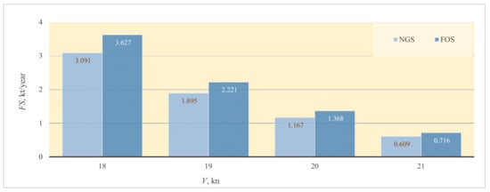 Finally, based on the calculated values of , the total fuel savings and CO2 emission reductions per year for a FO- and NG-fueled ship, can be calculated as follows: