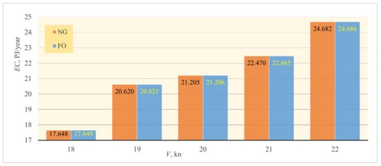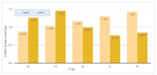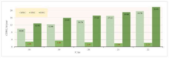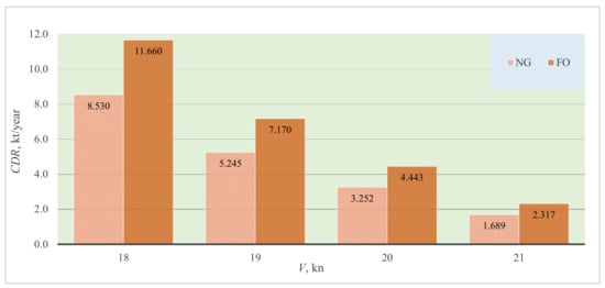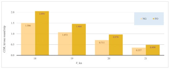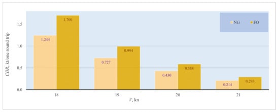 Additionally, the gasification effects on CDR are considered for the ecological valorization of the container ship powered by NG compared to the one powered by FO. Therefore, the corresponding CO2 emission reduction (CDRG—CDR for gasification) for slow steaming speeds is calculated as follows: