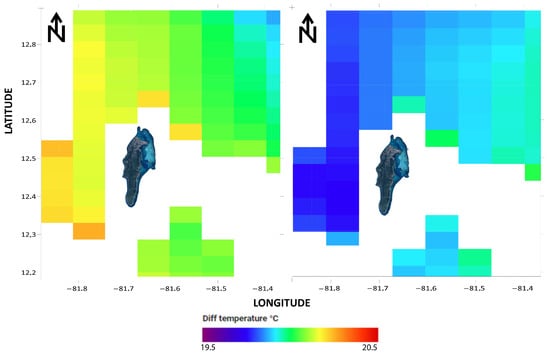 Differential on water temperature between surface and 1000 m depth around San Andrés Island on March (left) and September (right).