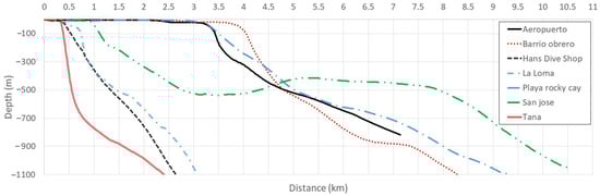 Figure 2 shows the bathymetric profile for seven points at San Andrés Island. The seven points selected are Airport, Barrio Obrero, Hans Dive Shop, La Loma, Playa Rocky Cay, San José, and Tana. The specific location of these points can be found in []. The bathymetric and temperature conditions of the seven points are presented in Table 2. Where is the distance from the coast to where the platform break is generated, is the depth where the platform break starts, is the distance from the coast to reach 1000 m depth, is the minimum temperature differential and is the maximum temperature differential. It can be seen that the maximum width is around 4 km.