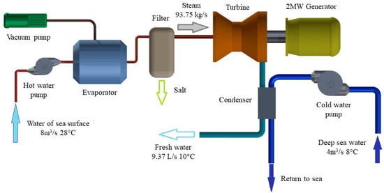 A schematic diagram showing values for an open-cycle OTEC system of 2 MW.