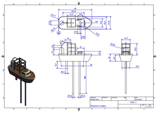 Due to the island’s conditions, an offshore floating OTEC is chosen. An offshore installation is selected instead of an onshore one since San Andrés Island has a high density and limited onshore space. On the other hand, the 1000 m depth is obtained near the coast, reducing transmission costs to the coast of both the electrical energy and the water produced. By the calculations shown above, the pipes’ sizes and the plant itself are dimensioned. A preliminary design is created and shown in Figure 4.