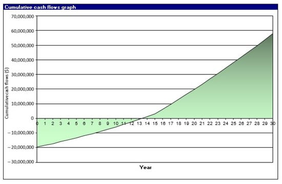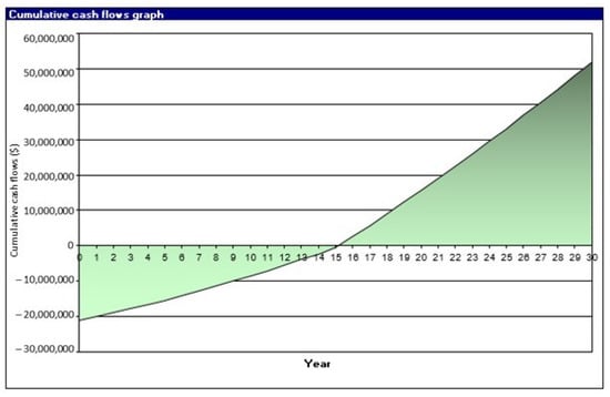 The two incomes add up to an annual total of USD 2,952,964. The project starts to be profitable after year 15. After that, some profits greatly exceed the annual costs, as shown in Figure 7.