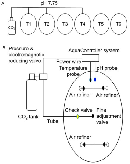 Experimental design and schematic of the CO2 regulation apparatus. T1, T2, and T4 were enriched with CO2 to a final concentration of ~1,200 ppm (A), ultimately resulting in a pH of ~7.75, while the other three mesocosms served as controls (ambient CO2; pH of ~8.2). Pure CO2 gas was bubbled into the tank through the “air refiners” (B; similar to the more common “microbubble stones”).