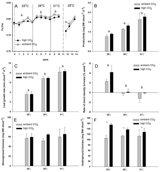 Variation in select physiological response variables in Thalassia hemprichii exposed to ambient or high CO2 levels. (A) Fv:Fm, (B) productivity, (C) leaf growth rate, (D) rate of shoot density increase, (E) aboveground biomass, and (F) underground biomass in T. hemprichii samples incubated at either ambient (grey) or high (black) CO2. All values represent mean ± SE (n = 3), and letters (a, b) above bars in (A–D) represent Tukey’s differences (p < 0.05) for the effect of temperature only; asterisks (*) in F instead denote CO2 effects at each temperature (p < 0.05).