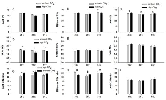 The chemical content of Thalassia hemprichii. The carbon content, nitrogen content, and carbon/nitrogen (C:N) ratios of roots (A,D,G, respectively), rhizomes (B,E,H, respectively), and leaves (C,F,I, respectively) in T. hemprichii plots incubated within ambient (grey) and high-CO2 (black) mesocosms. Values represent mean±SE (n = 3), and letters (a,b) above bars in (C,H) represent Tukey’s differences (p < 0.05) for the effect of temperature only; asterisks (*) in (D,G) instead denote within-stage CO2 effects (p < 0.05).
