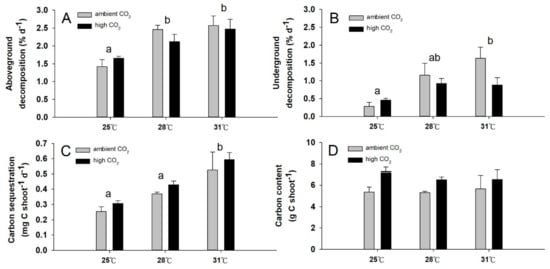 GCC has been predicted to lead to organic carbon loss in the soil [63]. Herein, the decomposition rates of the shoots both above and underground increased significantly after the temperature was raised from 25 to 28 °C. This could be due to metabolic rate increases in the small invertebrates and microbes responsible for such a decomposition. As a result, elevated temperatures may cause organic carbon sequestered in plant debris and buried in sediments to break down more rapidly through decomposition, reducing the capacity of these ecosystems to serve as carbon sinks. Furthermore, although T. hemprichii leaves significantly increased their productivity and carbon sequestration in response to elevated temperatures, short-term carbon storage was not influenced by temperature; this indicates that warming does not increase the short-term carbon sink capacity of this seagrass species. However, high CO2 levels appear to have offset the negative effects of high temperature on T. hemprichii with respect to the response variables assessed herein (i.e., decreased rate of shoot density increase and increased decomposition rate of seagrass debris).