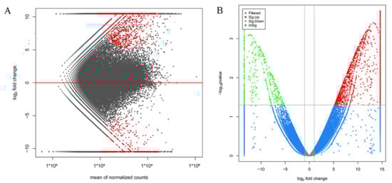 MA map and volcano map of DEGs. (A) is the MA map of the DEGs’ distribution in the testis and in the ovary of M. rosenbergii; the horizontal x-axis is the normalized average, and the y-axis is a log2 FoldChange. Each dot represents one gene. The red dots represent the DEGs. (B) is a volcano plot of the DEGs’ distribution in the testis and the ovary of M. rosenbergii; the horizontal axis is a log2 FoldChange, and the vertical axis is a log10 p-value. Each dot represents one gene. The DEGs are marked in red and green.