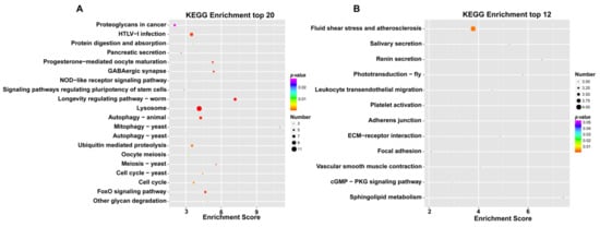 In addition, the KEGG pathway analysis further determined the sets of the DEGs, which were included in certain biological functions. The KEGG analysis of the female and male M. rosenbergii transcriptome revealed the vast majority of the KEGG pathways of female M. rosenbergii to be involved in the “longevity regulating pathway” (ko04212), “lysosome” (ko04142), “progesterone-mediated oocyte maturation” (ko04914), “oocyte meiosis” (ko04114), “meiosis-yeast” (ko04113), “autophagy-animal” (ko04140), and “HTLV-I infection” (ko05166), which suggests that these metabolic pathways are actively expressed in female M. rosenbergii (Figure 3A). The seven metabolic pathways had the highest enrichment scores in the ovaries of M. rosenbergii. The KEGG analysis of the female and male M. rosenbergii transcriptome revealed the vast majority of the KEGG pathways of male M. rosenbergii to be involved in the “sphingolipid metabolism” (ko00600), “renin secretion” (ko04924), “phototransduction-fly” (ko04745), “salivary secretion” (ko04970), “ECM-receptor interaction” (ko04512), “fluid shear stress and atherosclerosis” (ko05418), “leukocyte transendothelial migration” (ko04670), “vascular smooth muscle contraction” (ko04270), “adherens junction” (ko04520), and “platelet activation” (ko04611), which suggests that these metabolic pathways are actively expressed in male M. rosenbergii (Figure 3B). These 10 metabolic pathways had the highest enrichment scores in the testis of male M. rosenbergii.