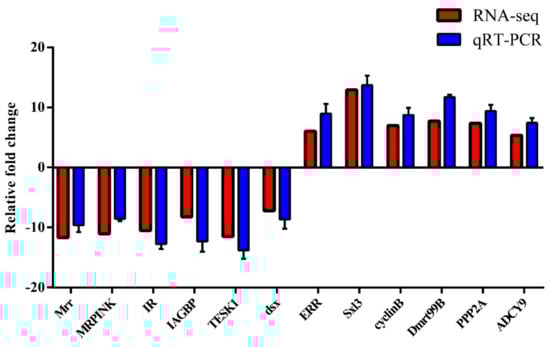 In order to validate the reliability of the transcriptome data, 12 sex-related DEGs significant to the regulation of gonadal development and sexual differentiation were chosen for the qRT-PCR analysis. These DEGs were Mrr, MRPINK, IR, IAGBP, TESK1, dsx, ERR, Sxl3, cyclinB, Dmrt99B, PPP2A, and ADCY9. RNA-seq expression profiles were compared with the fold changes identified by qRT-PCR. All 12 DEGs showed uniformly consistent results in the transcriptome sequencing data and qRT-PCR (Figure 5), thereby indicating the reliability of the transcriptome sequencing data. These findings serve as a useful genomic resource for validating candidate genes for gonadal development and sexual differentiation in M. rosenbergii.