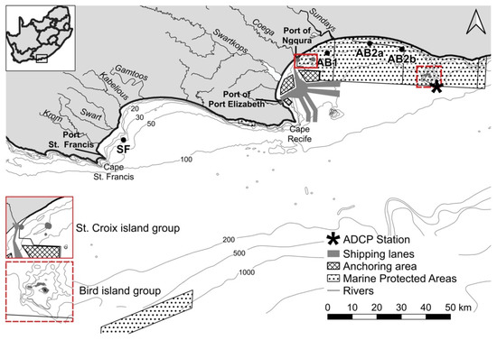 Map of St. Francis Bay (west) and Algoa Bay (east) along the Eastern Cape coast, South Africa. Deployment sites (SF, AB1, AB2a, and AB2b) are shown as large solid dots and the Acoustic Doppler Current Profiler (ADCP) station as an asterisk. Shipping lanes and anchoring areas are depicted in the northwest section of Algoa Bay. Boundaries of Marine Protected Areas (MPAs) are depicted by the dotted boxes.