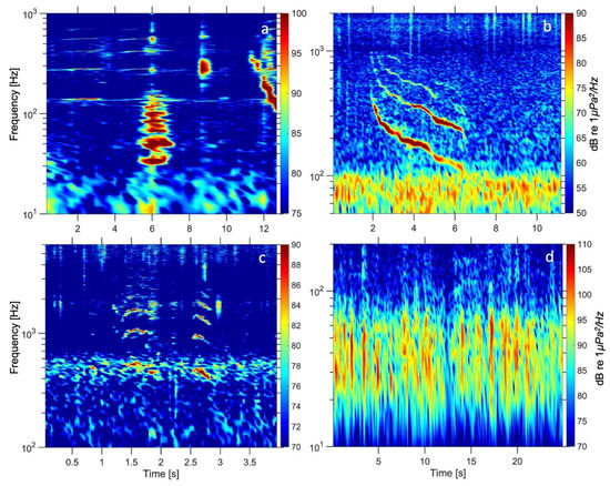 Frequency-modulated tones (whistles, 6–24 kHz) and pulsed sounds (clicks and burst pulses, 7–24 kHz) produced by dolphins were detected year-round at all sites, but in <10% of inspected samples. Humpback whales (Megaptera novaeangliae) were recorded from mid-June until mid-December, with more extensive vocalisations in Algoa Bay than in St. Francis Bay. Energy from calls and songs was most intense between 100 Hz and 1 kHz. Humpback whale vocalisations were occasionally combined with non-vocal sounds produced by surface behaviours (Figure 4a, [104]. Less frequent marine mammal vocalisations recorded in both bays included southern right whale (Balaenoptera australis) calls detected between June and August. The most frequent call was a broadband pulse with energy extending up to 24 kHz, also known as the gunshot sound [105]. Occasionally, low-frequency (<100 Hz) Bryde’s whale (Balaenoptera edeni) vocalisations were also recorded (Figure 4b, call Be6 in [106]).