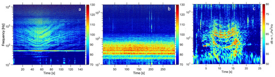 The most pervasive and persistent anthropogenic sound in the oceans is that from large commercial vessels (i.e., >300 t), which have increased underwater ambient noise levels in the 10–100 Hz frequency range over the last five decades [29,30,31,32,33,34]. Within close range, vessels of all sizes also raise sound levels over higher frequencies (i.e., up to 160 kHz [35]). Consequently, vessel noise falls within the hearing and communication range of a wide range of marine animals and so can have potentially negative effects (e.g., [36,37,38]). How vessels contribute to overall sound budgets varies widely over space and time: from being a pronounced contributor (e.g., [39,40,41]), to being present in hourly spectrograms without leaving a statistically significant footprint (e.g., [9,42]), to possibly being completely absent [39].