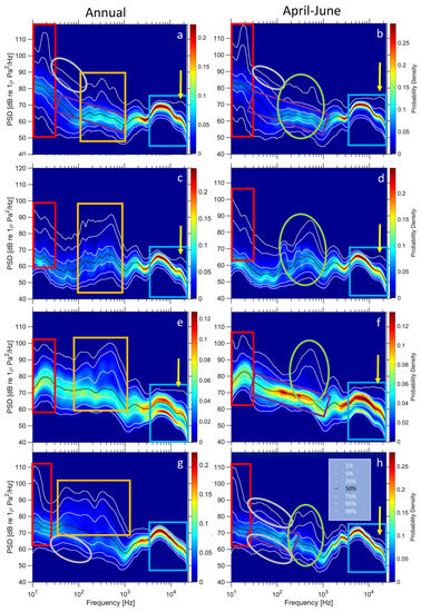 Power spectral density (PSD) percentile and power spectral probability density (PSPD) plots for SF (a,b), AB1 (c,d), AB2a (e,f), and AB2b (g,h) from top to bottom, respectively. Left panels are based on annual data, right panels are based on data for the same year, but only from April to June. Flow noise (red boxes), wind (purple boxes), combined biophony (i.e., squid, fish, and humpback whales overlapping in frequency: orange boxes), snapping shrimp (blue boxes), and dolphin buzzes (yellow arrows) were the main contributors to measured sound levels. Biophony between 100 Hz and 1 kHz in April-June was dominated by fish choruses (green ellipses). Vessels contributed to sound levels at all sites but could only be identified in plots for SF (a,b) and AB2b (g,h: grey ellipses).