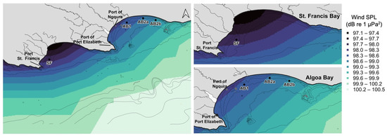 Maps of modelled wind noise over 2015 are shown in Figure 8. Modelled wind noise in 2015 ranged from 97 to 101 dB re 1 μPa2, with lowest received levels modelled for St. Francis Bay. A comparison between sites revealed a ~1 dB increase in wind-driven noise from west to east with an SPL of 98 dB re 1 μPa2 modelled for SF and AB1, and an SPL of 99 dB re 1 μPa2 modelled for both AB2 sites (Table 3). Wind models over April–June showed a decrease of ~1 dB in both bays. Consequently, the pattern of increased wind noise at the recording sites from west to east was also seen in April–June (Table 3). While this trend of increasing wind noise from west to east directly related to the increase in observed wind speed (i.e., the input data into our wind noise model), the 1 dB difference was small compared to the uncertainty in absolute wind noise levels. Modelled wind noise depends on the altitude above the sea surface at which wind speed is measured, on the water depth, and on the seafloor composition. However, with all of our acoustic recording sites in shallow water close to shore, these factors would have had the same effect at all sites.