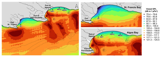 Modelled average received mean-square sound pressure level (SPL) from all vessel classes combined, in St. Francis Bay and Algoa Bay, Eastern Cape, South Africa. Levels represent the maximum over the top 100 m from vessels traversing up to 80 km from Cape St. Francis (i.e., headland south of Port St. Francis).