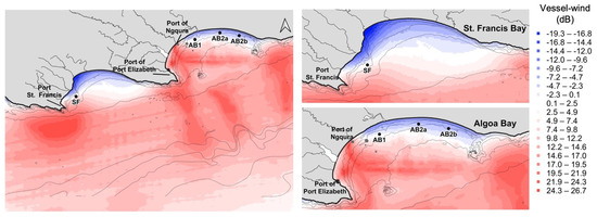 Modelled vessel noise less modelled wind noise in St. Francis Bay and Algoa Bay. Blue shades indicate areas where wind noise exceeded vessel noise, white area indicates the transition phase where vessel noise started to dominate wind noise, and red shades indicate areas where vessel noise exceeded wind noise.