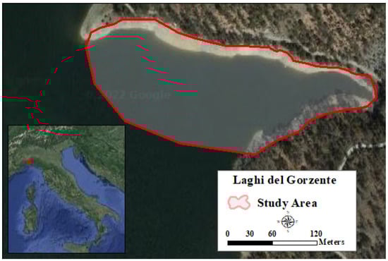 The study was carried out on a small portion (20,550 m2) of Laghi del Gorzente, located in the provinces of Genoa (Liguria) and Alessandria (Piedmont). Laghi del Gorzente are three artificial basins produced by the dams and they serve as a retention structure and water storage for ecosystem conservation by reviving the environment which is itself rather barren. The study area has a funnel-shape that lies embedded in a steep valley. The land cover surrounding the lake with a steep bare slope is characterized by mixed sedimentation, composed of a combination of rocky coast, gravels, sand and silt with tall trees on the outer boundaries which sets a natural limit to the lake. The study area is shown in (Figure 2).