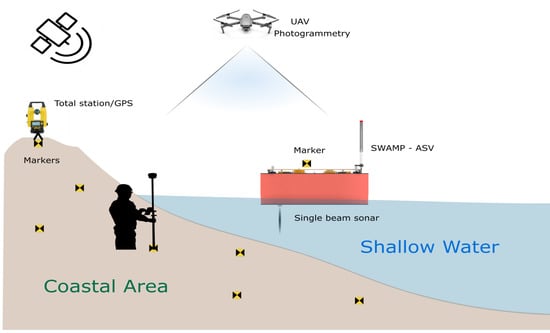 In this section, the survey techniques and methods carried out in the study area are presented. The interdisciplinary and integrated approach through integrating several survey techniques, i.e., photogrammetry from the UAV and smartphone, the SBES mounted on SWAMP, and the Total station, is described in the following (Figure 3).