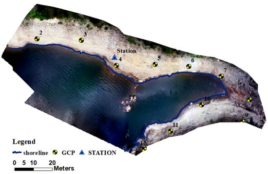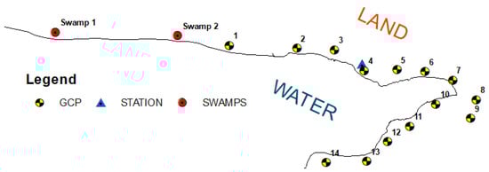 The computation of the local coordinate system is based on the azimuthal and zenithal angles coming from the total station to compute X, Y and Z for every point. Local coordinates are provided in Table 1, where point 1 and point 2 relate to SWAMP location, points 1A–14A represent GCPs and point sh is measured on the shoreline as a zero level surface. e represents the points elevation with respect to the real surface water level measured through the survey campaign. The local coordinates were determined by the software Sierrasoft Topko [27], respectively for X, Y and Z components, by assigning a coordinate for the total station position (X, Y, Z) as (1000, 1000, 1000) m. The computed values are shown in Table 1.