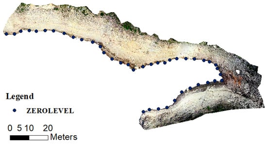 Afterwards, the merged point cloud elaboration allowed us to obtain an orthophoto with 2 cm/pixel resolution, which can be useful for the evaluation and visual analysis of topographic area. The orthophoto generation was the last step of the workflow using the Agisoft Metashape© software. All points are imported to GIS with the obtained orthophoto. The measured GCPs and the markers shown by the georeferenced orthophoto fit each other perfectly. The points that represent the zero-surface level, i.e., the points along the shoreline that define the real water level with respect to land, were also imported to the GIS. These points are extracted from the digitized shoreline of the lake. The zero-level points that are distributed along the shoreline in the study area are the base of the continuous interpolation surface between the emerged and submerged areas. Forty-one points are displayed in Figure 7 below, which represent the zero-level point.