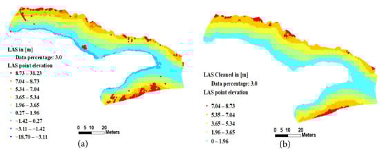 DSM of the emerged zone. In (a), outliers are represented in red color close to the outer boundary of the study area, while (b) represents the emerged zone after filtering and cleaning noises to obtain a more reliable elevation range starting from the shoreline, thus obtaining a DSM ranging from zero to 8.75 m.