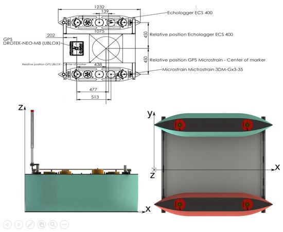 The synchronization in time between the acoustic sensor and the GNSS receiver provides distance measurements related to real world position. The measured points coordinates were expressed in terms of latitude and longitude in WGS84, while the heights were represented in terms of measured distances between the SBES and ground at nadir. Knowing that the position of GNSS and SBES mounted on SWAMP have different locations, bathymetric data computation was performed, taking into account a common reference frame for sensors on the SWAMP vehicle (Figure 9).