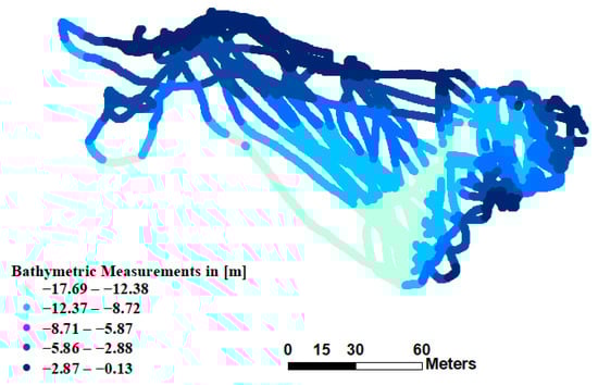 The acquired bathymetric data are represented by colors ranging from light blue to dark blue, according to the increasing energy of the refracted acoustics signal. A lighter blue represents deep water, whereas a darker blue is used to display shallower areas, where the intensity of the refracted acoustic signal is higher. So, from Figure 10, an initial idea for the variation of depths over the study area could be noticed, depending on the color range of the points measurements.