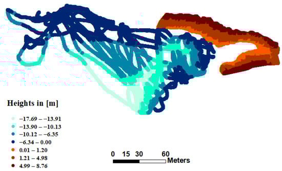 After showing the results for topographic and bathymetric data separately, the data are merged together on the basis of the calculated control points and the digitized shoreline between the two data sets. Data merging is performed by using a dedicated tool in GIS that provides a single continuous model. As previously described, the merging operation is carried out with respect to the same horizontal and vertical reference frame and taking into account the water level as the zero level for the elevation determination; furthermore, the dense point cloud has been used to represent the topographic area highlighted in brown (Figure 11). The used dense cloud has been filtered by deleting those outer limits defined as noise. Close to the shoreline, the color of the points is light brown, standing for low elevation values. The shoreline overlaps perfectly between the emerged and submerged area. The results are displayed in Figure 11 and show the merged datasets and the topographic and bathymetric measurements. This is the first step to obtaining a common continuous model of both environments.