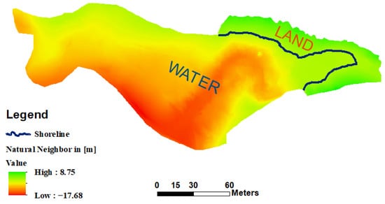 After merging the data, the last step to obtain the DSM is to interpolate the data depending on the elevation measurements. As already stated, among several interpolation methods, the Natural Neighbor interpolation has been considered one of the most suitable methods for these scattered data. Since SBES is used, it is essential to guarantee, through the interpolation, being within the range of the samples used. Hence, Natural Neighbor interpolation was used knowing that it does not infer trends nor produce peaks or valleys that are not already represented by the input samples. Natural Neighbor interpolation seeks to find the closest sample point to a query point and assign weights to each based on polygon proportionate areas around each point. The results of the obtained DSM from the Natural Neighbor interpolation with a resolution of (5 × 5 cm), shown in Figure 12, range between −17.68 m for maximum depth and 8.76 m as the maximum height from the water level.