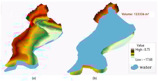 Three dimensional (3D) model for rendering visualization analysis; (a) shows the geomorphology of the entire merged area, while (b) shows the results of water flow modeling and water volume determination.