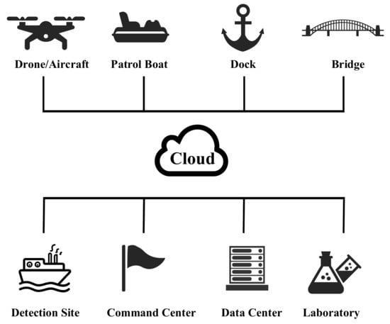The current experiments in monitoring ship emission are primarily oriented towards research or isolated monitoring activities rather than comprehensive monitoring, which does not meet the needs of maritime authorities for emission monitoring and supervision. Therefore, we designed portable exhaust monitoring equipment which could be deployed in a variety of areas such as on drones, aircraft, patrol boats, docks, and bridge cranes. Ship emissions were monitored in real-time and in all weather conditions, and measurement data were sent to a cloud computing center. After processing and analysis, the data were used to provide information services and decision support to local maritime law enforcement personnel. The data could be sent to data centers for storage and further analysis, or be used as data sources for scientific research. Following this approach, a monitoring network model was built consisting of grid points + suspicious target tracking + multiple data fusion + spatial–temporal data analysis.