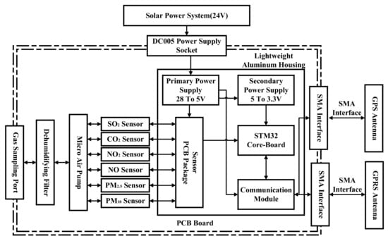Monitoring equipment for ship emissions must be capable of all-weather and all-day monitoring performance, but must also account for a variety of installation locations and direct exhaust monitoring, which requires humidity resistance and low power consumption. As shown in Figure 2, the hardware consisted of a solar power system, gas sampling port, dehumidifying filter, micro air pump, gas and particulate matter sensors, sensor PCB package, power supply, STM32 core board, communication module, GPS antenna, and GPRS antenna.
